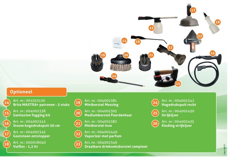 Daarnaast is de Greensteaming 5 uit te breiden met een strijkijzer en een kleding strijkijzer en meer optionele accessoires, zie downloads.